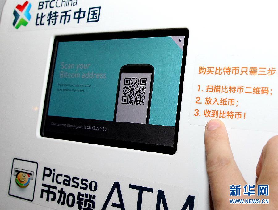 4月16日,一位市民在比特币ATM机上操作。 4月15日,中国内地首台比特币ATM机在上海张江高科技园区的一家咖啡店内正式亮相。通过这个终端设备,用户可将面值为100元或50元的人民币纸币塞进入钞口,ATM机根据实时交易价格将人民币金额转换成比特币,并收取一定金额手续费。目前上海的这台ATM机暂时不支持反向购买。新华社记者 陈飞 摄