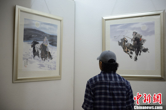 4月16日,内蒙古美术馆举办马主题的画展,作者为蒙古族,作品用中国画的绘画形式表现作者对马的喜爱。中新社发 刘文华 摄