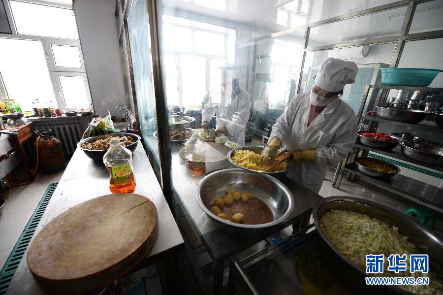 4月16日,哈尔滨香和小学希望厨房的厨师在准备午饭。新华社记者 王凯 摄