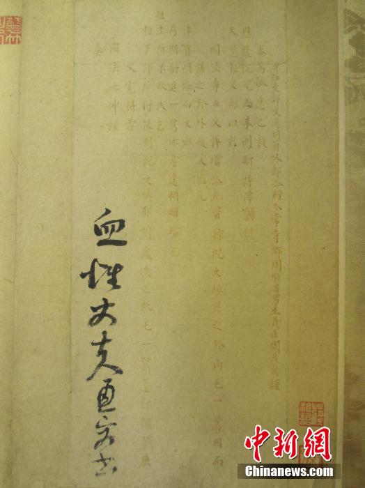 图为明末清初处士周茂兰为报父仇用鲜血写成的《血疏贴黄稿》。中新社发 李焯龙 摄
