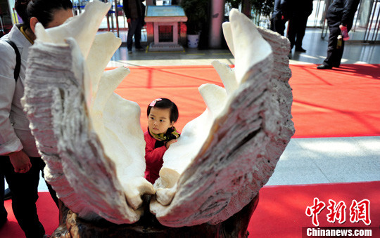 3月21日,一个小孩正在观赏大贝壳。当日,一对巨型砗磲贝壳化石亮相济南,吸引许多观者驻足欣赏。中新社发 张勇 摄