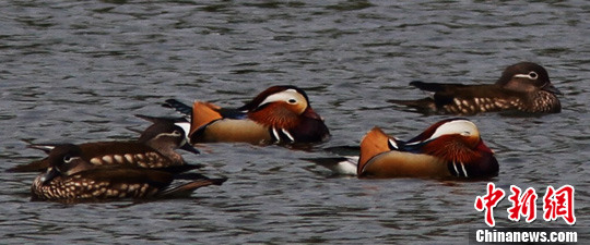 4月16日,天津大学青年湖内,几只野生鸳鸯在湖面游来游去追逐戏水,吸引了不少师生的关注。中新社发 蔡秀江 摄
