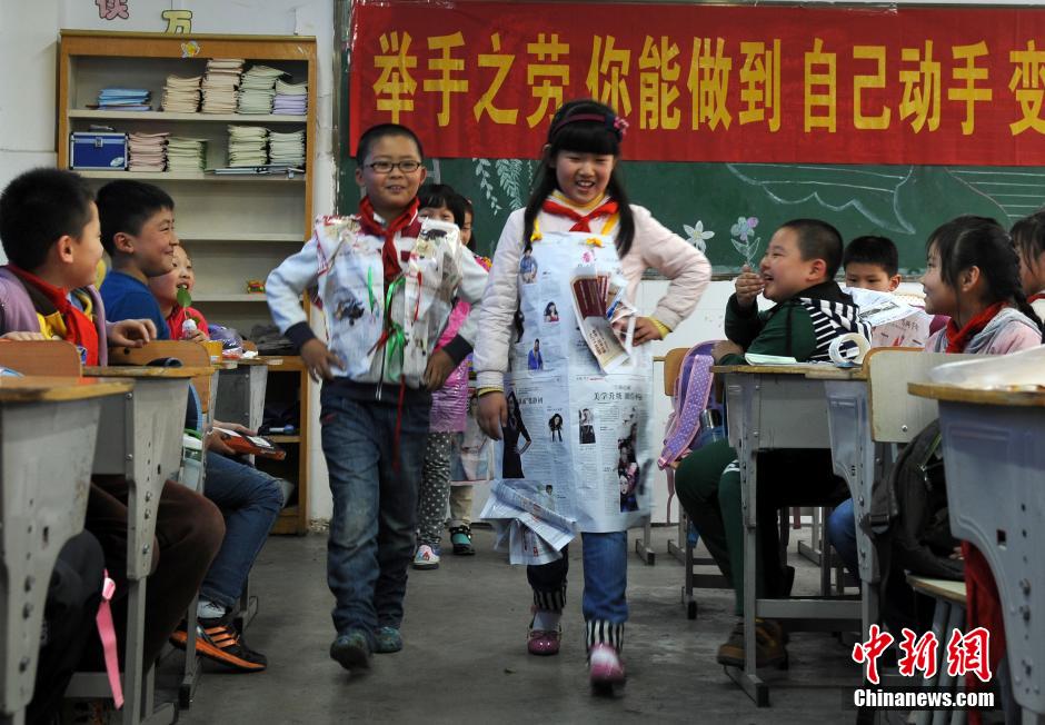 4月17日,小学生们用服装秀的方式展示用废旧报纸做的服装。当日,安徽省合肥市蜀山区琥珀小学的学生们举办了一场废物再利用活动,孩子们用废旧的物品做成衣服、自行车、机器人等。中新社发 韩苏原 摄