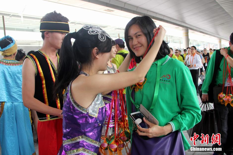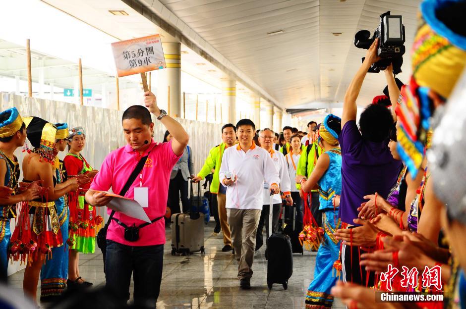 4月18日上午,由近600名香港各界人士组成的香港“共和国之旅-井冈山专列团”乘坐专列直抵广西柳州。现场穿着壮、苗等少数民族服装的青年,为香港青年团举行简短的欢迎仪式,并送上绣球。该青年代表团将在柳州开展四项特色主题活动,包括具有少数民族特色的“百家宴”、奖学金公益捐助活动、“我的中国梦”两地青年论坛以及两地青年联欢会。图为桂港代表合影。雷彬 摄