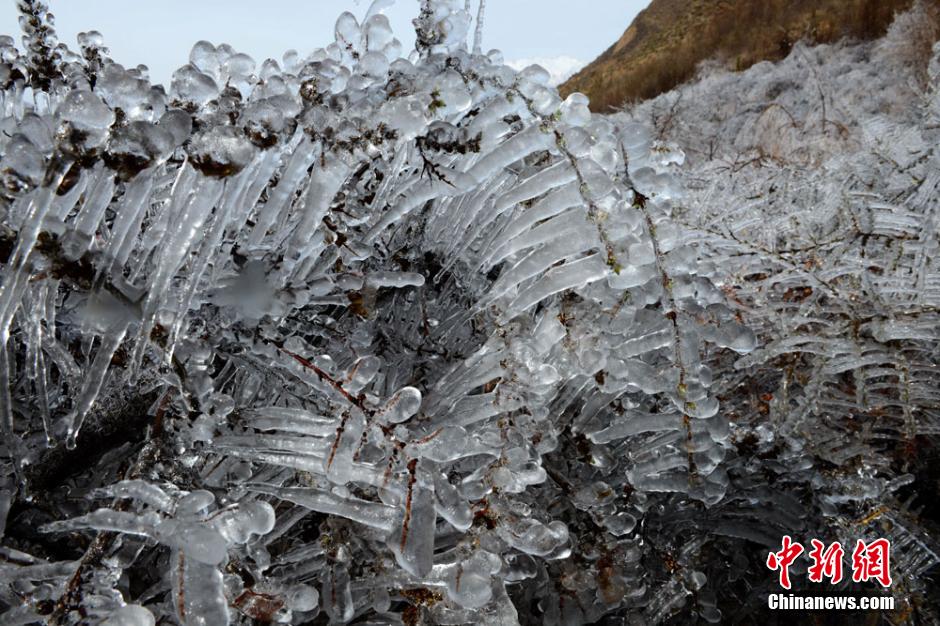 强冷空气突袭甘肃祁连山 山下树木现冰凌奇观