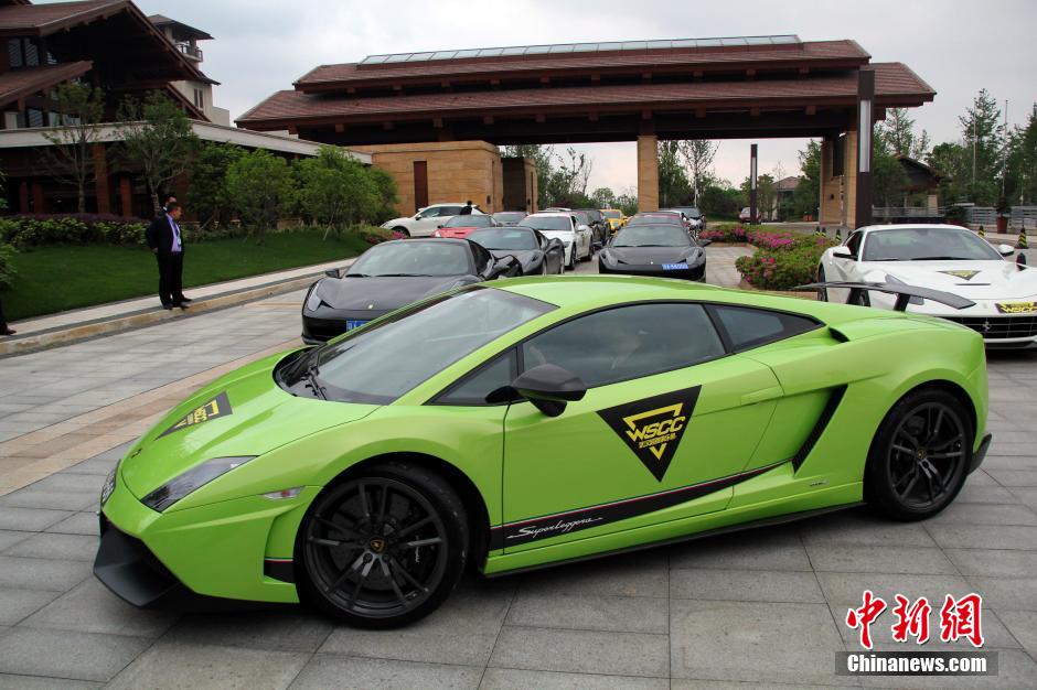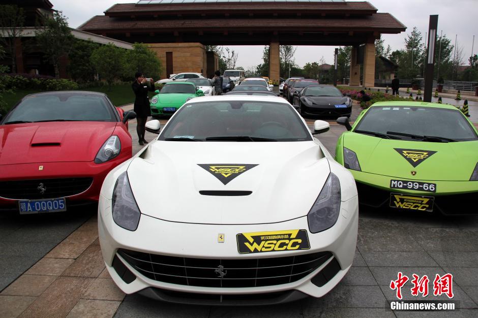 4月19日,华中地区史无前例的超豪华车队亮相江城武汉,武汉超跑俱乐部总价值超过1.2亿元的40多辆超级跑车亮相引发市民围观拍照。图为价值1.2亿的超级豪华车阵。中新社发 张畅 摄