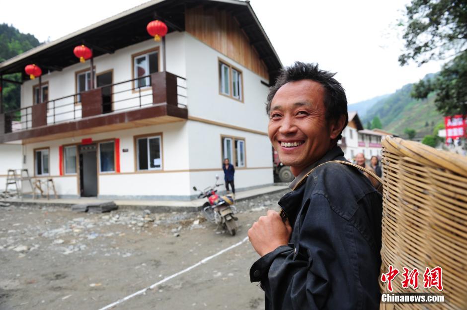 4月20日,芦山地震灾区灾后重建一周年纪念日,壹基金援建的轻钢抗震农房项目已建成248套,宝兴县大溪乡烟溪村部分民众入住新居。中新社发 陈文 摄