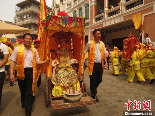 图为海南各宫庙纪念妈祖诞辰1054周年祭典仪式在海口中山路骑楼老街举行,千余名妈祖信民盛装沿老街巡游。中新社发 张茜翼 摄