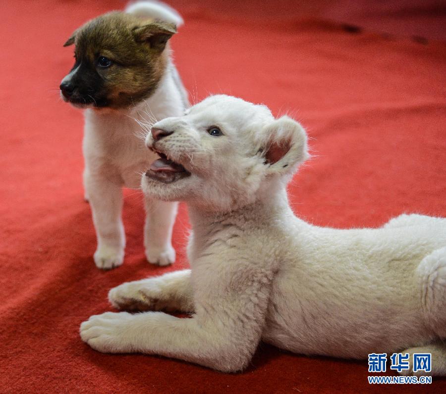 今年2月,浙江杭州野生动物世界出生了一只小白狮,由于狮妈妈出现“只生不带”的情况,饲养员和附近的热心村民帮助小白狮找到一只代班“狗奶妈”。小白狮经过“狗奶妈”和饲养员的精心照料,发育正常,还跟“狗奶妈”的孩子——几只小狗成为了好朋友,组成了一个特殊的“大家庭”。白狮是非洲狮的变种,世界上数量稀少,极为珍贵。 新华社记者 徐昱 摄