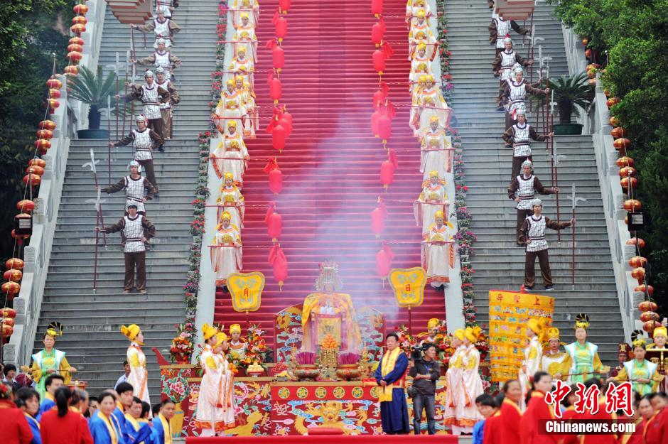 4月22日,新编祭典仪式以全新的面貌在妈祖1054周年诞辰日亮相。新编的祭典仪式在继承传统礼制、仪规的基础上,打破以往主祭人、陪祭人与演出活动分离的现象,将祭典议程与现场的合唱方阵(歌生)、舞蹈方阵(舞生)、乐队方阵(乐生)等有机结合在一起,突出仪式的观赏性,致力于将祖庙祭典仪式打造成融祭祀、朝拜、观光为一体的大型户外盛典。湄洲妈祖祭典与祭黄、祭孔并称为中华三大祭典,为海内外近3亿妈祖信众所瞩目。中新社发 张斌 摄