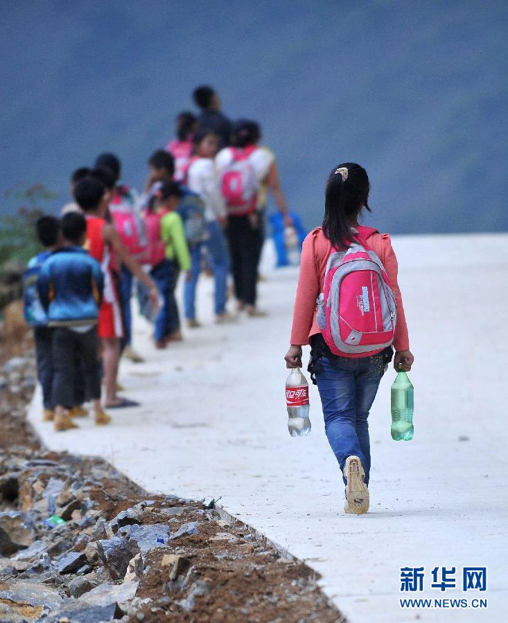 广西凌云县伶站瑶族乡浩坤村弄新小学位于大石山区深处,自然环境恶劣,由于学校附近没有水源,很多时候学校生活用水需要购买或是靠县里有关部门送水,学校一年至少花费四五千元用来买水。每个学生每天从学校取一瓶水用于淘米洗碗、刷牙洗脸,学生们在校寄宿时无法洗澡洗衣服。另外,很多学生每周一从家里自带一两瓶水作为一个星期寄宿生活的饮用水。新华社记者 黄孝邦 摄