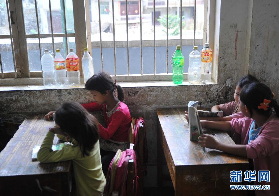 在广西凌云县伶站瑶族乡浩坤村弄新小学,教室的窗户上放着孩子们从家里带来的水(4月21日摄)。新华社记者 黄孝邦 摄