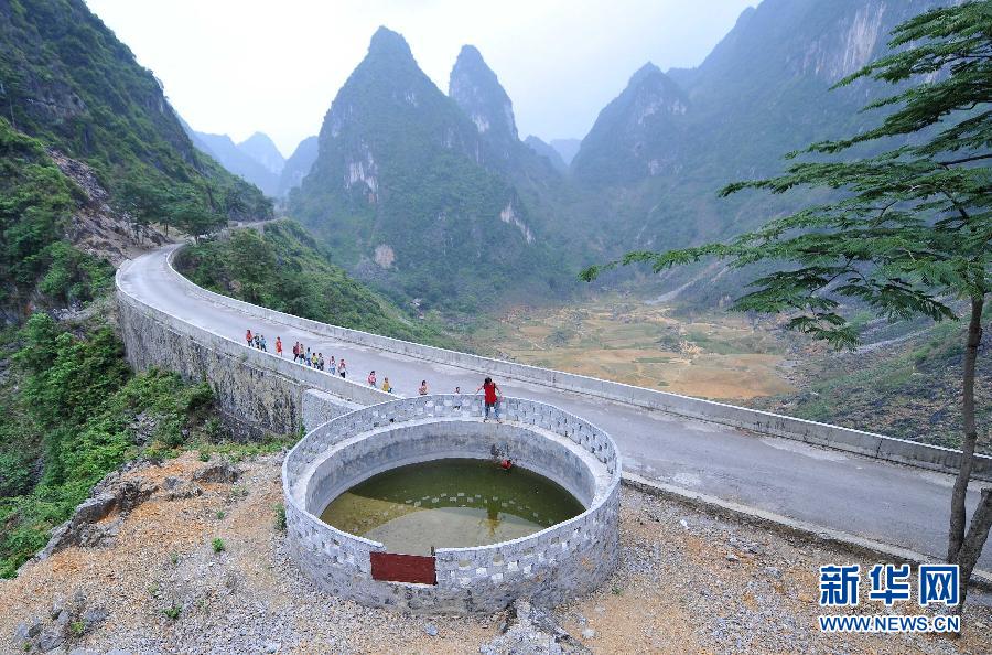 4月21日,在广西凌云县伶站瑶族乡浩坤村,孩子们提水去学校,路过一个村民的水窖,水窖已经见底,水质很差。新华社记者 黄孝邦 摄