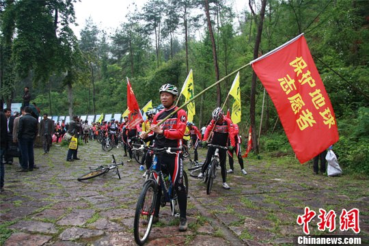 4月22日是世界地球日,浙江志愿者参与骑行活动,倡导绿色环保出行。当天,浙江省第45个“世界地球日”纪念活动在仙居县举行。中新社发 张平 摄