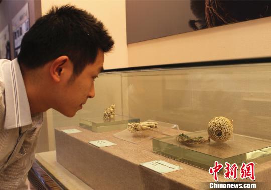 4月22日,“粤艺缤纷——明清时期广东传统工艺精品展”在重庆中国三峡博物馆展出。图为展览现场,镂雕福寿宝相花十一层象牙球。周毅 摄