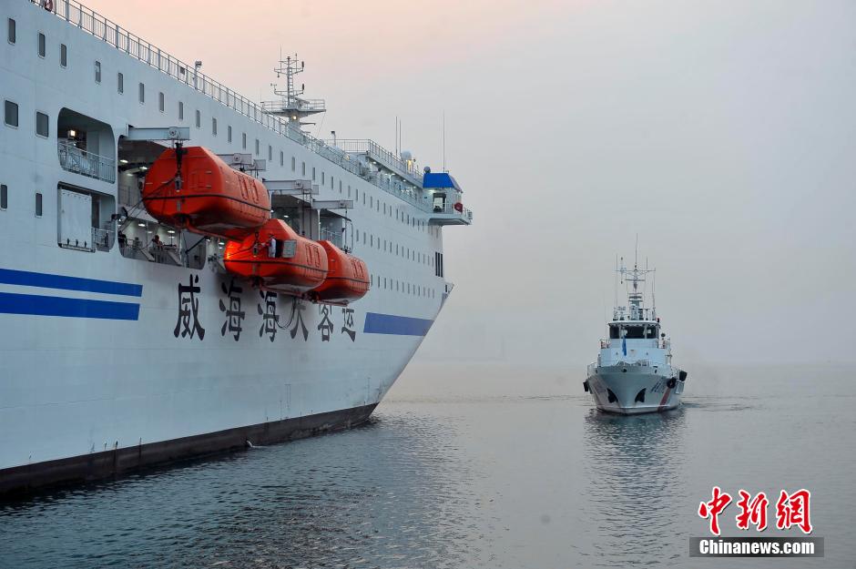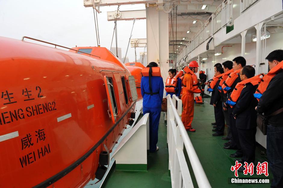 4月22日傍晚,威海海事局组织航行在渤海湾威海至大连航线的客滚船“生生2”轮进行弃船演习,演习了旅客转移、救生艇释放等海难事故发生时有关的项目。演习后,海事人员还对“生生2”轮进行了全面的安全检查。中新社发 张付寿 摄