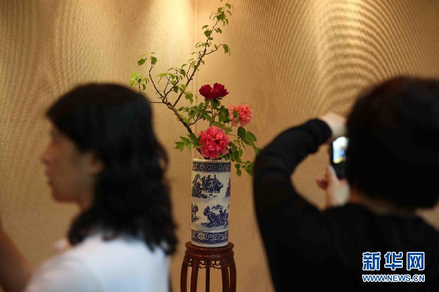 4月23日,在北京植物园,两名游客在欣赏插花艺术作品。