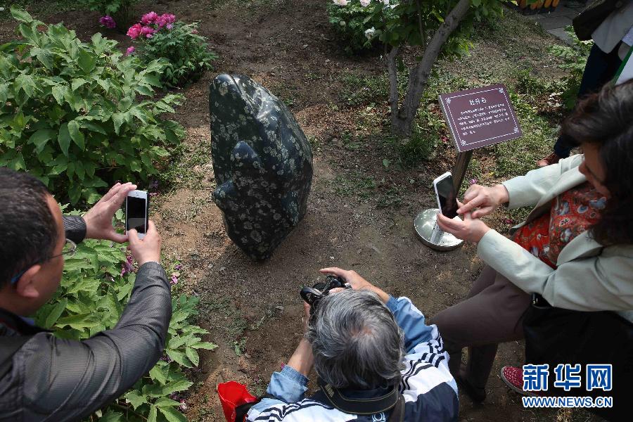 4月23日,在北京植物园,游客在拍摄刚刚揭幕的牡丹石。新华社记者 金立旺摄