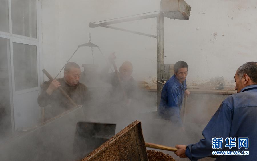 4月24日,迁安市贯头山酒业有限公司的工人在蒸料车间工作。新华社记者杨世尧摄