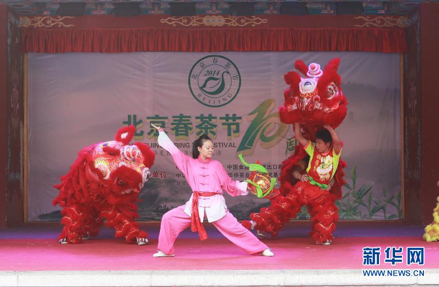 4月23日,演员在春茶节开幕式上表演舞狮。当日,“2014北京春茶节”在北京大观园红楼博物馆举行。本次春茶节以“品饮华夏茗茶享受健康生活”为主题,将举办一系列茶事活动,为京城百姓推荐更丰富的茶叶品类,倡导健康的茶叶消费理念。 新华社发(张燕辉 摄)