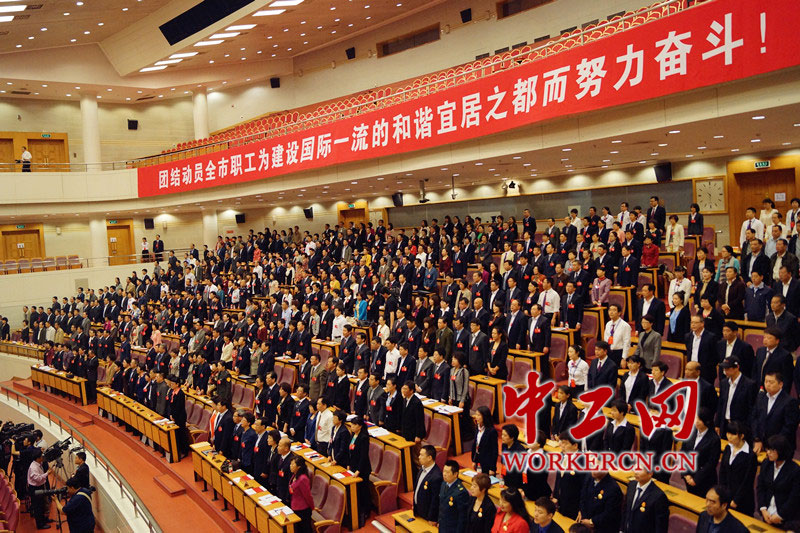 中华全国总工会副主席、书记处第一书记陈豪在讲话中对北京市工会工作给予充分肯定。他强调,北京各级工会始终紧跟党的步伐,紧密团结广大职工,充分发挥了党联系职工群众的桥梁纽带作用、国家政权的重要社会支柱作用、职工群众利益代表者和维护者作用,创造了极具推广价值的宝贵经验,为做好新形势下城市工会工作树立了典范。他要求北京各级工会,深入学习贯彻习近平总书记系列重要讲话精神,坚持用中国特色社会主义工会发展道路指导实践,不断凝聚广大职工为实现中国梦而努力奋斗。图为全体代表起立合唱国歌。中工网记者 葛姗 摄