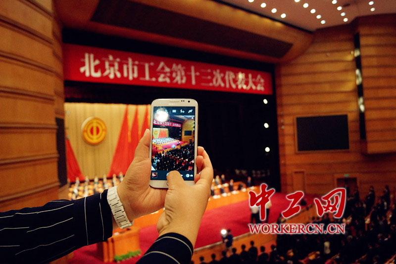 图为许多参会代表用手机拍照留念。中工网记者 葛姗 摄