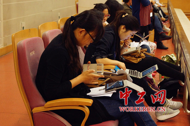 北京市委书记郭金龙强调,工会工作必须坚持正确的政治方向,必须坚持党的领导和社会主义制度。要把工作重点放在职工群众最困难、最操心、最忧虑的实际问题上,切实维护好职工群众的合法权益。要不断改进工作作风,着力加强组织建设,努力成为坚持党的群众路线、密切联系群众的表率,团结带领全市广大职工群众,奋力谱写中华民族伟大复兴中国梦的首都新篇章。图为参会记者忙碌的身影。 中工网记者 葛姗 摄