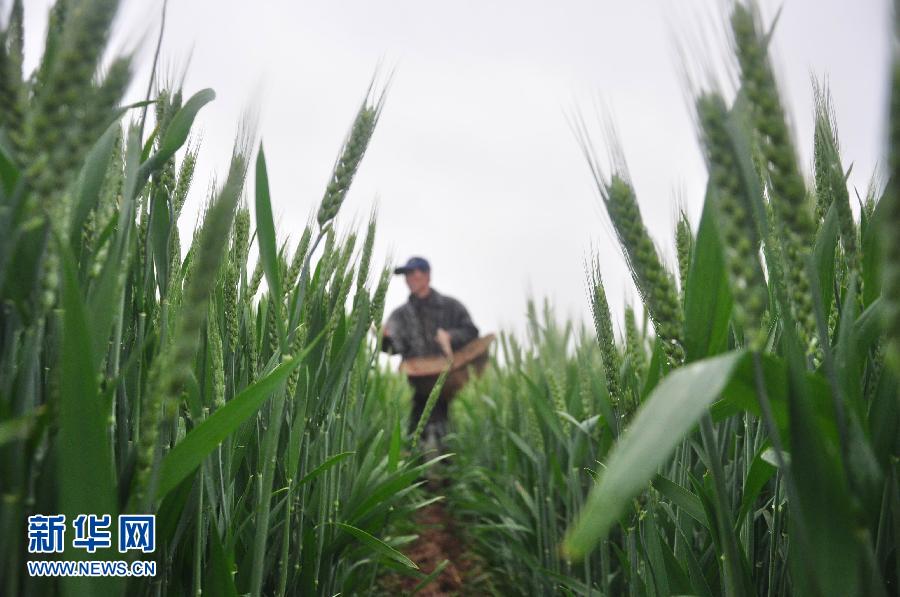 4月26日,山东省聊城市茌平县贾寨镇村民在给雨后的麦田施肥。