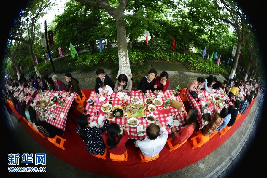 4月26日,食客们在杭州“全牛宴流水席”上就餐。当日,2014第五届杭州拱墅运河美食节的“压轴大戏”——“全牛宴流水席”在京杭大运河边的大兜路美食街开席。本场“全牛宴流水席”设138桌,一字排开总长约450米,由100名厨师共同制作。整台全牛宴菜品以牛的各个部位为原料,辅以绿色食材加工而成,供千余人同时开席。新华社发(李忠 摄)