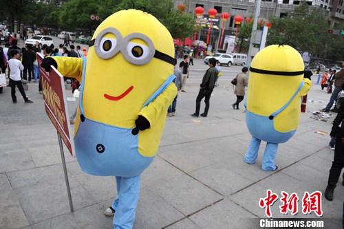 4月26日,在陕西咸阳市的一处广场上,几个憨态可掬的“小黄人”手举广告牌,游走于人群中。引得众多市民围观,并纷纷合影留念。中新社发 张远 摄