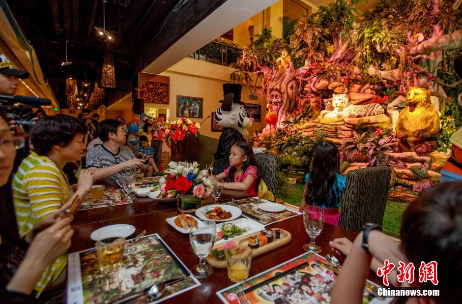 4月27日,由美国顶尖技术团队为广州长隆酒店白虎自助餐厅重磅打造的、中国首创在主题餐厅内滚动上演的森林童话动雕剧院——白虎自助餐厅动雕剧场,拉开其神秘帷幕。其引人入胜的童话剧场,以及逼真、生动、会说话的动雕,足以让餐厅里的大小朋友惊喜不断。中新社发 刘卫勇 摄