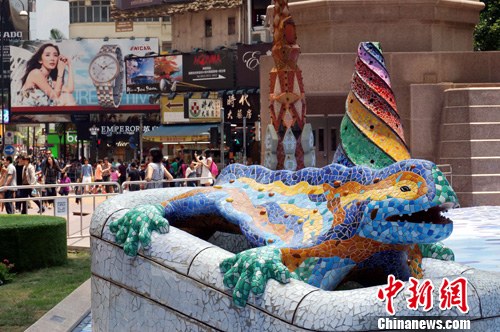 4月27日, 香港时代广场“高廸建筑展”上的一只“青蛙”。中新社发 洪少葵 摄