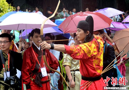 4月26日,作为第二届海峡汉服文化节的重要组成环节——首届中华射礼大赛在福州于山风景区冒雨举行。中新社发 刘可耕 摄