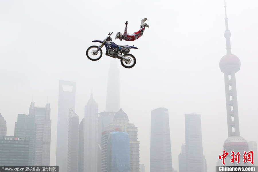 4月27日,“外滩摩托飞跃秀”在上海标志性地点虹口区北外滩举行,来自澳大利亚的顶尖车手迈克尔·诺里斯和约珥·布朗以浦东陆家嘴天际线为背景,表演了肢体后空翻、抓车座空中腾跃、单手倒立等绝活。据悉,此次“外滩摩托飞越秀”是为五一期间在上海举行的全球顶级极限运动赛事——2014世界极限运动大赛预热造势。