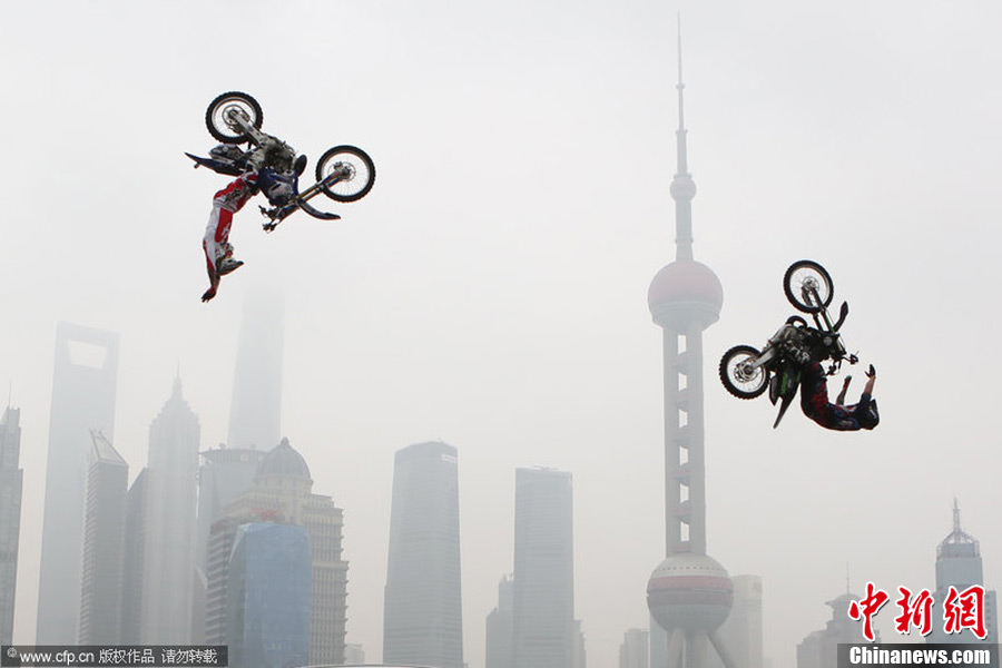 4月27日,“外滩摩托飞跃秀”在上海标志性地点虹口区北外滩举行,来自澳大利亚的顶尖车手迈克尔·诺里斯和约珥·布朗以浦东陆家嘴天际线为背景,表演了肢体后空翻、抓车座空中腾跃、单手倒立等绝活。据悉,此次“外滩摩托飞越秀”是为五一期间在上海举行的全球顶级极限运动赛事——2014世界极限运动大赛预热造势。