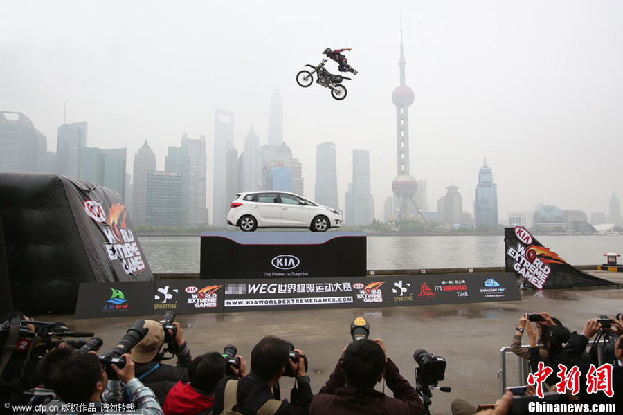 4月27日,“外滩摩托飞跃秀”在上海标志性地点虹口区北外滩举行,来自澳大利亚的顶尖车手迈克尔·诺里斯和约珥·布朗以浦东陆家嘴天际线为背景,表演了肢体后空翻、抓车座空中腾跃、单手倒立等绝活。据悉,此次“外滩摩托飞越秀”是为五一期间在上海举行的全球顶级极限运动赛事——2014世界极限运动大赛预热造势。