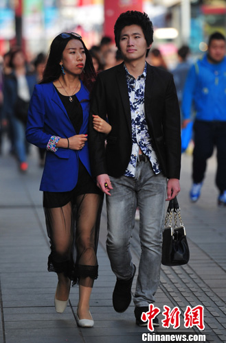 4月27日,随着天气的转暖,春装时尚的美女走在沈阳街头,成为一道亮丽的风景线。中新社发 于海洋 摄