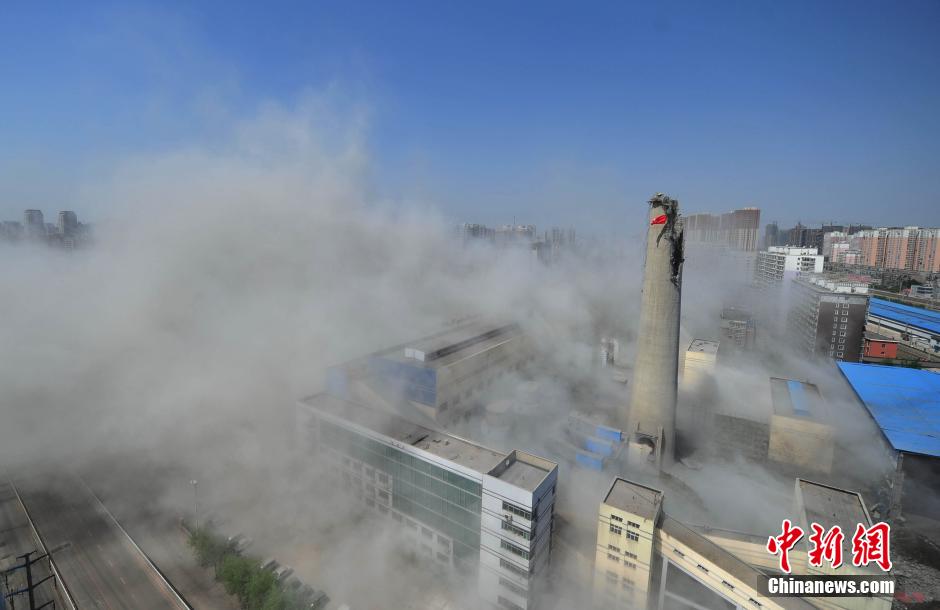 4月28日,沈阳第三热力供暖公司大烟囱进行爆破。当日,公司院内的150米高的大烟囱在上午10时28分进行首次正式烟囱拦腰爆破。爆破之前公安及公司安保人员已经对爆破拆除周围的16个警戒区进行了详细划分,对进行珠江桥周边警戒封闭,确保这些区域没有人员、车辆通行。中新社发 于海洋 摄