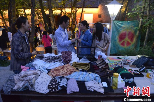 4月27日晚,成都市锦江区街头,一些青年男女利用周末时间摆开“跳蚤市场”,将一些首饰、衣物等日常用品卖给有需要的人。中新社发 张浪 摄