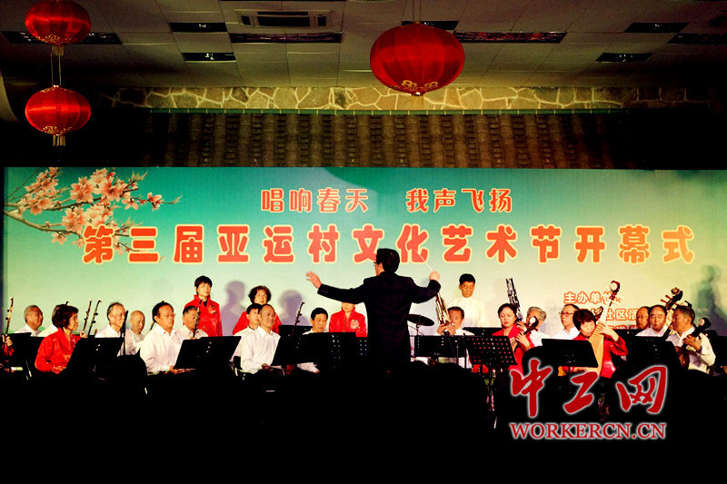2014年4月28日,由亚运村社区活动中心、亚运村街道总工会、亚运村街道团工委、亚运村街道妇联、北京中华民族博物院共同主办的“唱响春天,我声飞扬”第三届亚运村文化艺术节在中华民族园开幕。图为器乐合奏《哒姆哒姆》,拉开文化艺术节的序幕。中工网记者 葛姗 摄