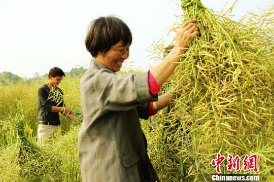 农民正在抢收油菜籽。何红福 摄
