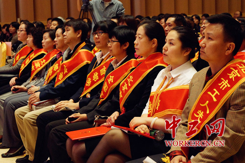 图为2014年受表彰的先进集体和个人以及历届劳动模范代表正在认真听会。中工网记者 葛姗 摄