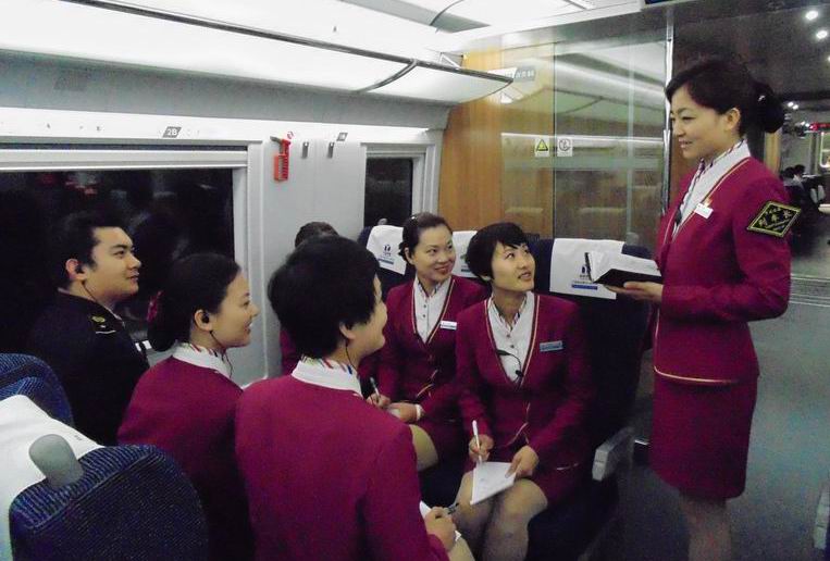 作为G55/56次动车列车长的王娇珑,在开车后还有一项重要工作,那就是随同乘警检验车票,并巡视车厢,为乘客的安全出行把好每一道关。图为王娇珑利用有限的时间召开班组会议,安排部署值乘工作。(王一 摄)