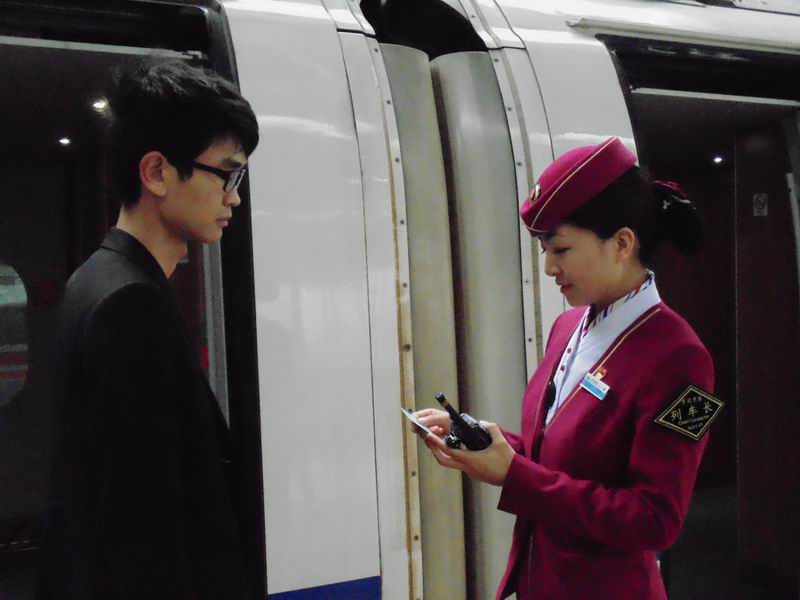 图为G55/56次动车女列车长王娇珑正在查验车票,核对旅客信息。(王一 摄)