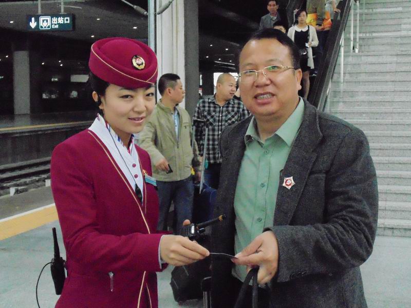 图为G55/56次动车女列车长王娇珑在为旅客做引导。(王一 摄)
