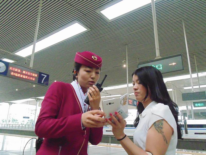 图为G55/56次动车女列车长王娇珑在为旅客做引导。(王一 摄)
