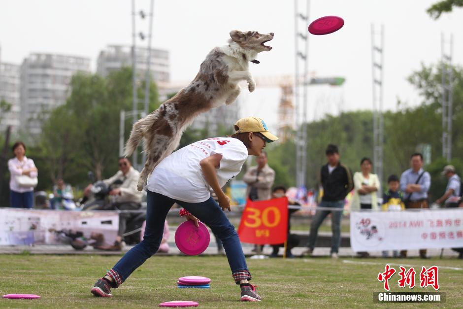 5月2日,参加飞盘狗比赛的狗狗进行花式比赛,与主人配合上演高难度动作。当日,由AWI飞盘狗世界杯中国组委会、南京布瑞迪宠物SPA美容生活馆主办的“中国好狗狗”宠物运动嘉年华暨2014AWI飞盘狗世界杯40周年中国预选赛在南京举行,近百只狗狗参赛。AWI飞盘狗世界杯是由飞盘狗运动创立者成立的国际比赛,各国举行预选赛后,获奖选手将被邀请到美国参加世界总决赛。中新社发 泱波 摄