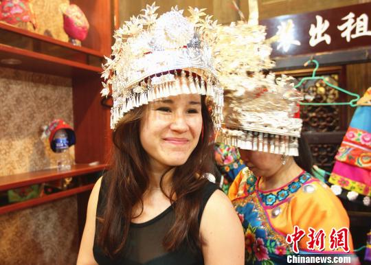 5月2日,重庆酉阳桃花源景区人潮如织,34名在渝留学生畅游桃花源。留学生在景区穿起苗族服装,体验中国民族文化。图为重庆酉阳桃花源景区内,外籍留学生体验苗族服装。 周毅 摄