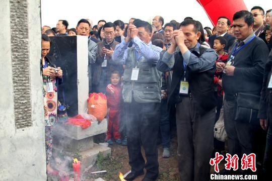 120余名来自新西兰等国家和中国各地的班氏后裔,2日在位于陕西省扶风县境内的班固墓及班氏故里祭祖寻根,并为当地班家谷的“班氏故里”石碑揭幕。图为班氏后裔班固墓前祭祖。田进 摄