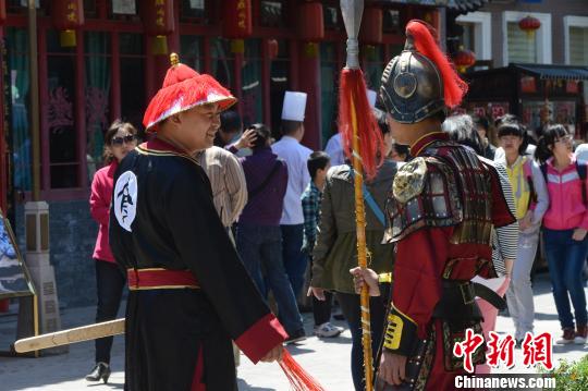 5月2日,山西太原明清一条街,两名保安分别扮成明朝和清朝士兵,共同守卫现代景区,相映成趣。中新社发 韦亮 摄